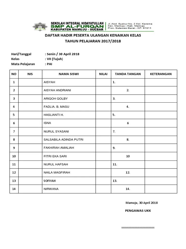 Daftar hadir sribhawono bidikmisi dan csr20152 dapat di download disini. Pengawas ujian memeriksa nomor absen dan nama lengkap peserta ujian dan memberi centang (√) pada lembar daftar hadir . 6) pengawas ujian mengedarkan daftar hadir ujian yang harus ditandatangai mahasiswa peserta ujian;. Selain itu ini menjadi bukti fisik telah dilaksanakan kegiatan uas (ujian akhir. Peserta uas sudah melaksanakan tugas dan mengikuti kegiatan uas.
